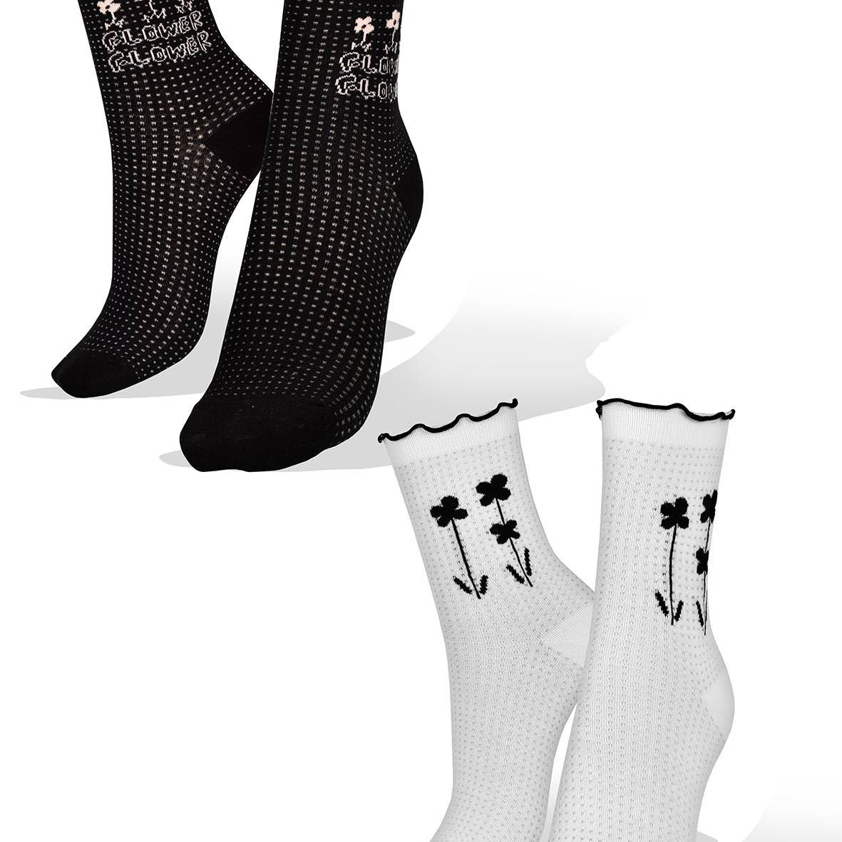 2 pares de Medias con Flores en Sinfonía de Blanco y Negro