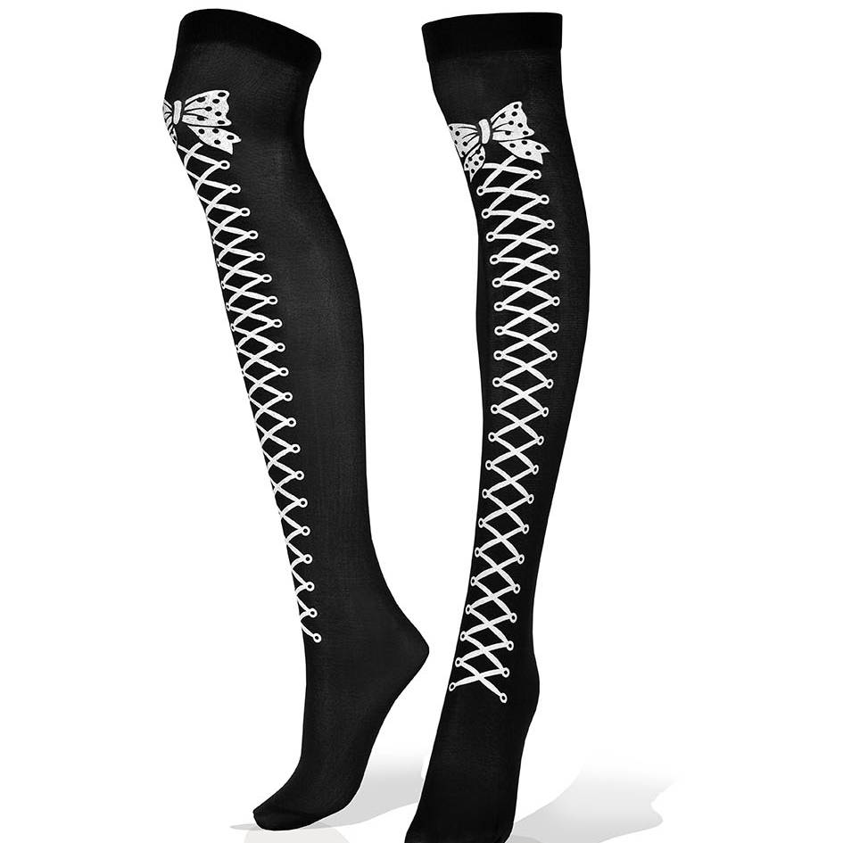 Medias Largas Altas Negras Cordones y Moña en Blanco