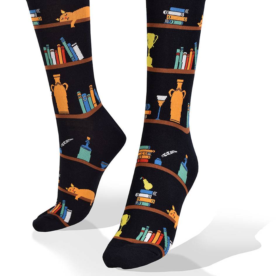 Medias con Libros en Biblioteca con Jarrón, Gato y Trofeo