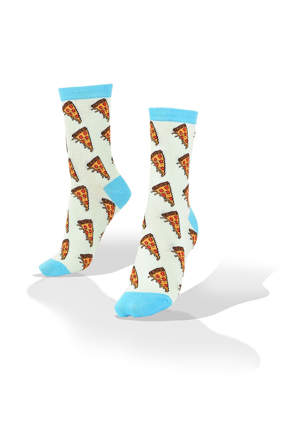 6 pares de medias con diseño de pizza, en una presentación con caja de pizza.