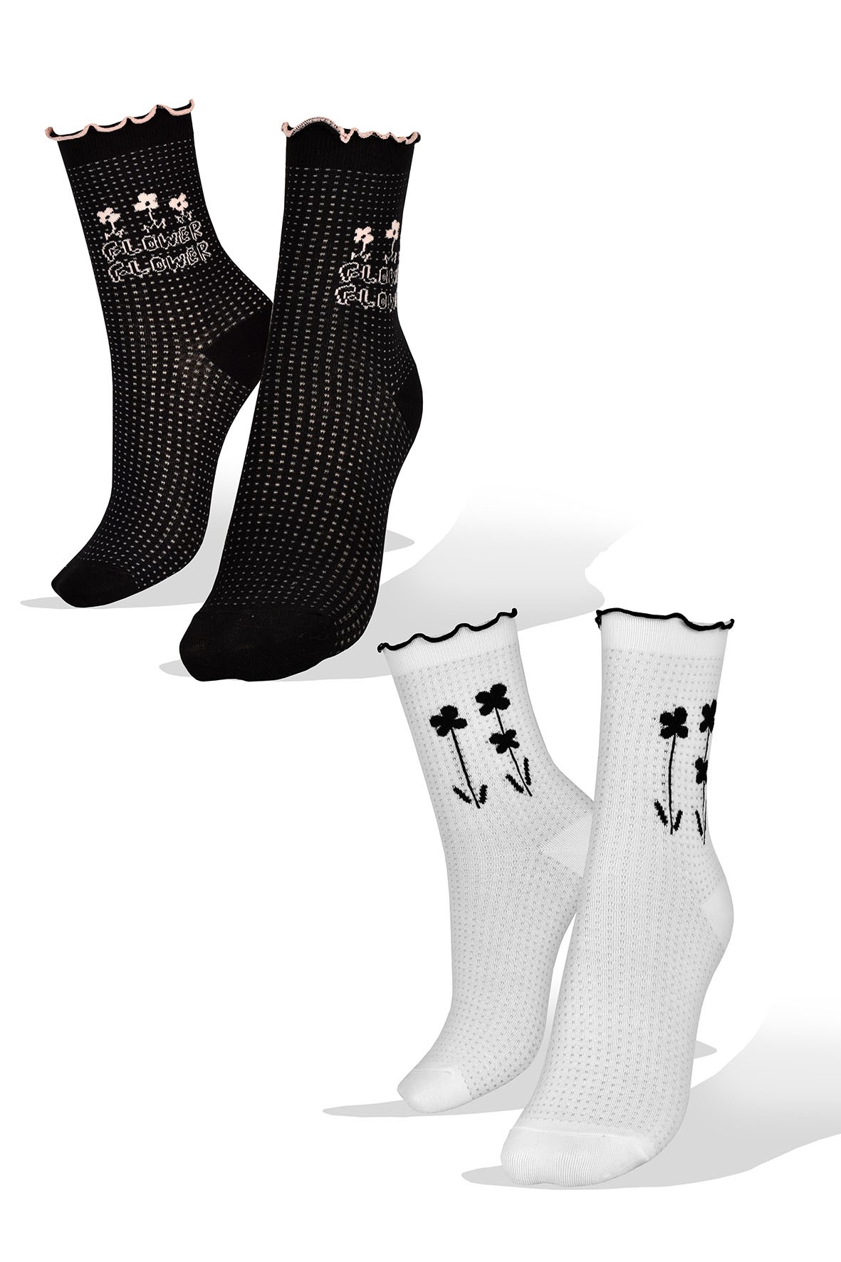 2 pares de Medias con Flores en Sinfonía de Blanco y Negro